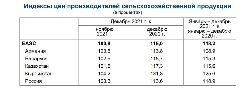 Всего по ЕАЭС в декабре 2021 года по сравнению с предыдущим месяцем цены на сельскохозяйственную продукцию у производителей выросли на 0,8%, в сравнении с декабрем 2020 года они увеличились на 15%. В Беларуси эти показатели были выше, чем в целом по союзу, – 2,9% и 18,7% соответственно.