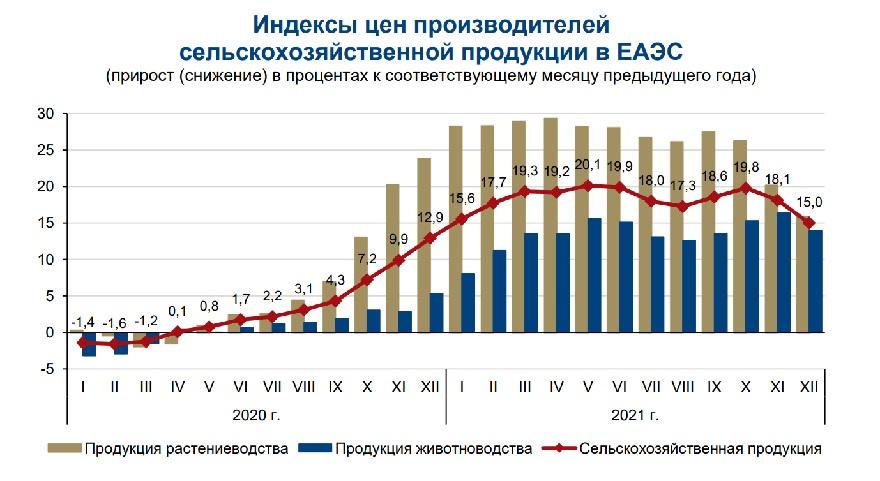 Представленная статистика касается роста цен в декабре 2021 года к декабрю 2020 года в странах-членах ЕАЭС, куда входят Беларусь, Россия, Армения, Казахстан и Кыргызстан. Одним из лидеров по этому показателю оказалась и наша страна: прирост цен отечественных производителей продукции растениеводства составил 26,4%, животноводства – 16,7%. В сравнении с ноябрем декабрьское увеличение составило 3,3% в растениеводстве и 2,8% в животноводстве.