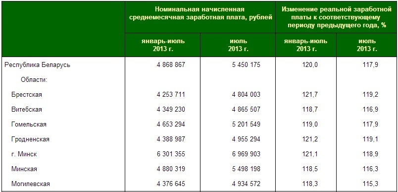 За июль 2013 года номинальная начисленная среднемесячная заработная плата белорусов выросла по сравнению с июнем на 5,6%.