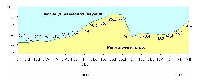 В следующей таблице приведен миграционный поток в Беларуси, чье положительное сальдо уменьшило естественную убыль. По сравнению с 2012 годом миграция в январе-июле 2013 года увеличилась на 36,6% и составила 5 645 человек.
