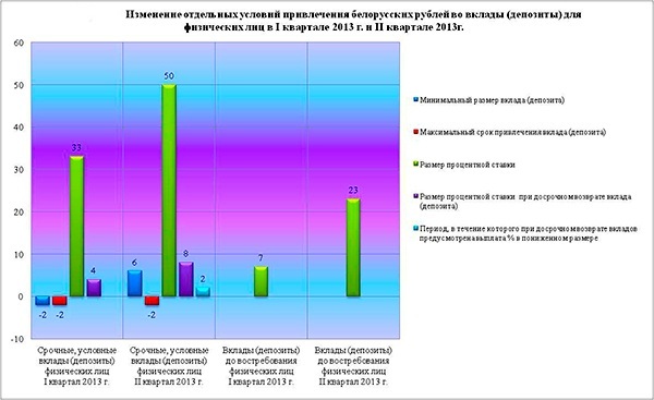 Для юридических лиц во II квартале 2013 г. банками были ужесточены условия привлечения белорусских рублей в срочные, условные депозиты по четырем параметрам: минимальный размер вклада, размер процентной ставки, размер процентной ставки при досрочном возврате вклада, и период, в течение которого при досрочном возврате вкладов (депозитов) предусмотрена выплата процентов в пониженном размере. По вкладам (депозитам) до востребования отмечено ужесточение условий только по процентной ставке.