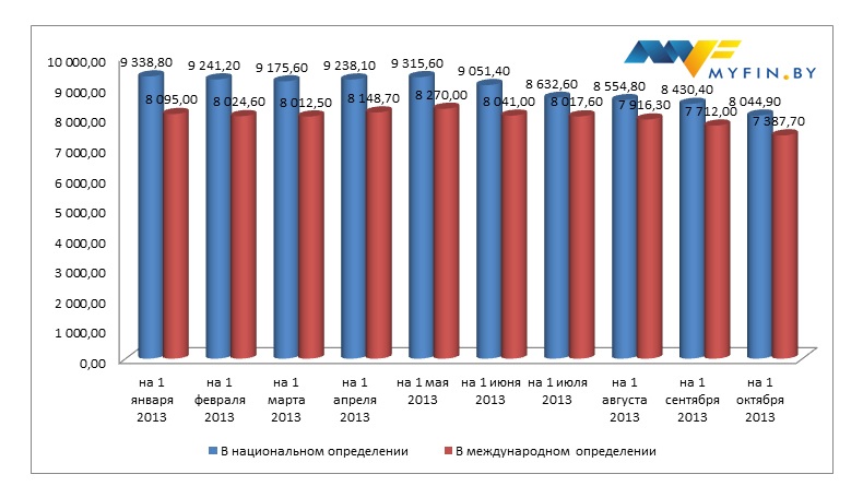 В национальном определении объем золотовалютных резервов сократился на 374,9 млн долларов США и на 1 октября 2013 г составил 8 044,9 млн долларов США в эквиваленте.