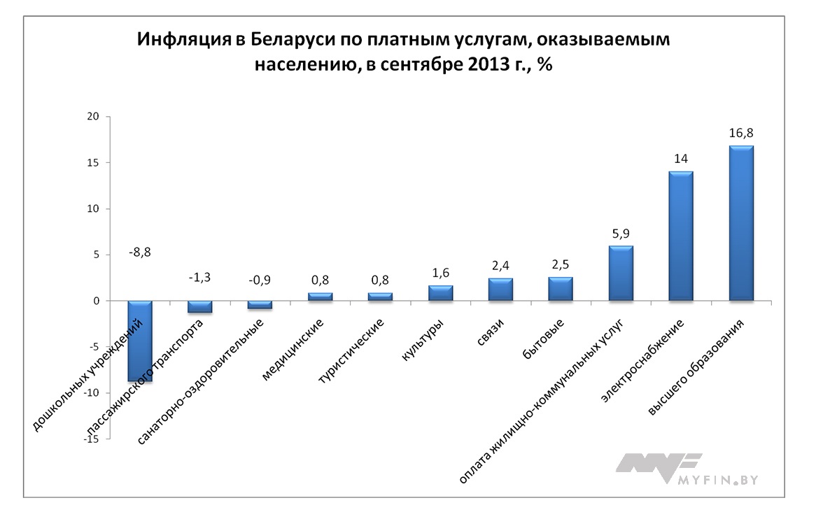 Из услуг в сентябре 2013 года подорожало высшее образование - на 16,8%, коммунальные услуги - на 5,9% (в частности электроснабжение на 14%), бытовые услуги - на 2,5%, услуги связи - на 2,4%.