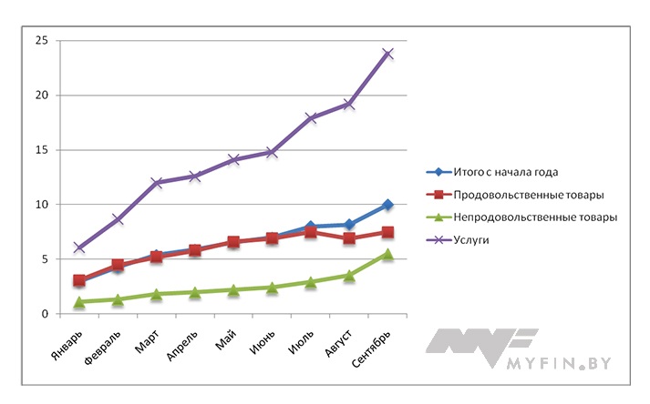 В общей сложности инфляция в Беларуси за январь-сентябрь текущего года составила 10%. В том числе инфляция по платным услугам, оказываемым населению - 23,8%, по основным группам непродовольственных товаров - 5,5%, по основным группам продовольственных товаров - 7,5%.