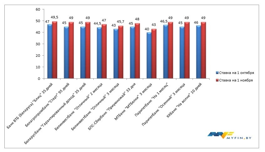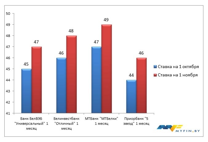 В пределах двух процентных пунктов выросли ставки по вкладам «Универсальный с фиксированной ставкой»Банка БелВЭБ, «Отличный» Белинвестбанка, «МТБелки» МТБанка и «5 звезд»Приорбанка. Обращаем ваше внимание, что ставка по вкладу Приорбанка в зависимости от суммы изменяется от 46 до 48% годовых. Для анализа мы брали наименьшее значение. Все вышеперечисленные депозиты открываются на 1 месяц.