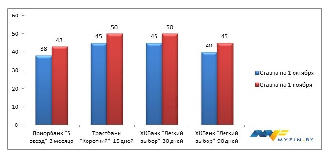 Среди новых депозитных продуктов, которые увидели свет в октябре, – «Теплая осень» ХКБанка (90 дней, 49% годовых), «Тройной бонус» Идея Банка (3 месяца, средняя ставка 50,5% годовых), «Осенний экспресс» Дельта Банка (15 дней, 50% годовых). Банк Москва-Минск возобновил заключение договоров вклада «Актуальный» на 45 дней, но уже под 49,9% годовых (в сентябре ставка составляла 45%).