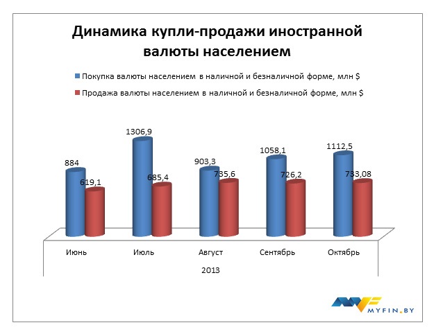На чистой основе в октябре население купило 379,5 млн $ в наличной и безналичной форме. Спрос на валюту со стороны физлиц по итогам месяца достиг отметки 1 112,5 млн $, а вот вернуло в обменники и кассы банков население всего 733,08 млн долларов США. Таким образом, белорусы пятый месяц подряд проявляют повышенный спрос на инвалюту, формируя очень несимпатичную картину по сальдо купли-продажи «иностранцев».