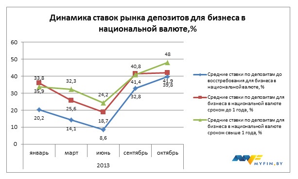 Ставки на рынке депозитов для бизнеса в национальной валюте по итогам октября установили новый годовой максимум. Нисходящий тренд первой половины 2013 года сменился в июне ростом доходности по вкладам. В итоге с января 2013 года процентные ставки по депозитам для юрлиц выросли более, чем в 1,5 раза. Сегодня наиболее выгодными являются вложения на срок более 1 года. Средняя доходность по таким депозитам по итогам октября находится на уровне 48% годовых.