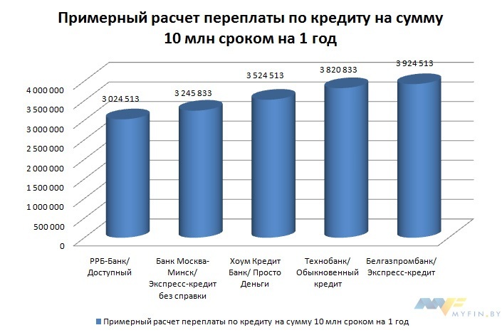 Переплаты по самым бюджетным на сегодня экспресс-кредитам наличными при сумме займа 10 000 000 сроком на 1 год колеблются в диапазоне от 3 до 4 млн рублей.