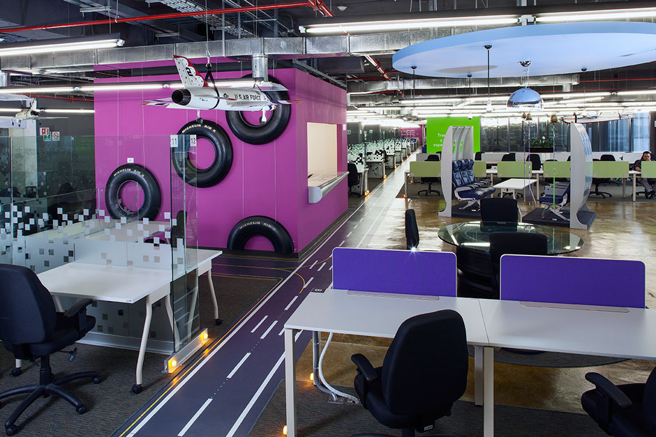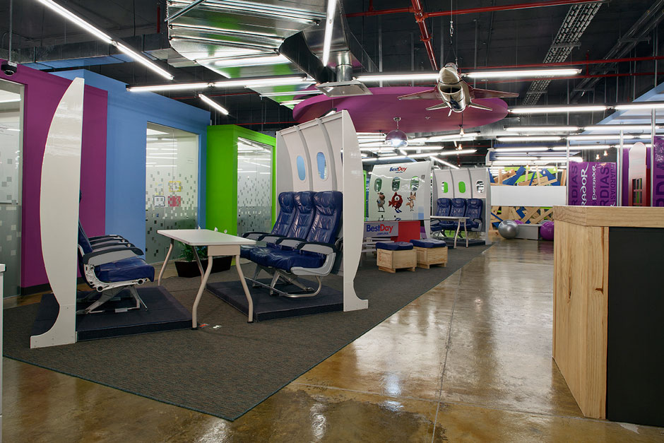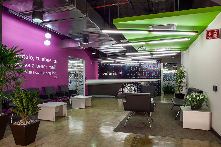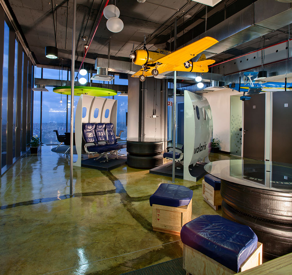 Офис авиакомпании Volaris полностью соответствуют сфере ее деятельности. Часто такое прямое цитирование негативно сказывается на дизайне, но не в этот раз. Стоит отметить, что и эко мышление не осталось в стороне – в интерьерах использованы реальные отработанные детали самолетов.