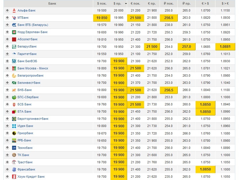 15 января 2016 года максимальный курс продажи доллара на 13.00 составляет 20 200 рублей (Евроторгкредитбанк), а курс евро 22 000 рублей (Альфа-Банк). Минимальный курс продажи доллара в обменниках Минска на 13.00 составляет 19 620 (ХКБанк), евро – 21 300 (ХКБанк).