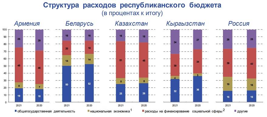 Статистика говорит о том, что больше всего бюджетных средств в Беларуси, как и в Кыргызстане, за прошлый год потратили на «общегосударственную деятельность». Причем в нашей стране в 2021 году доля таких трат наивысшая среди всех участников ЕАЭС – 50%. В остальных государствах ЕАЭС основной статьей расходов было финансирование социальной сферы – образования, здравоохранения, спорта, культуры, СМИ и социальной политики. Доля расходов на социальную сферу в Беларуси в сравнении с партнерами по ЕАЭС была самой низкой – 20%.