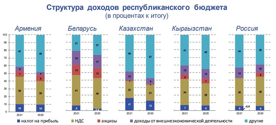 В структуре государственной казны все государства ЕАЭС демонстрировали увеличение налога на прибыль – в Беларуси его доля в доходной части бюджета увеличилась с 2,6% до 6%. Также во всех странах союза, кроме России, росла доля НДС. В бюджетной структуре нашей страны по-прежнему лидирующее место занимает налог на добавленную стоимость – 41% в 2021 году (+1% по сравнению с прошлым годом). Также с 17% до 18% выросла доля доходов от внешнеэкономической деятельности.