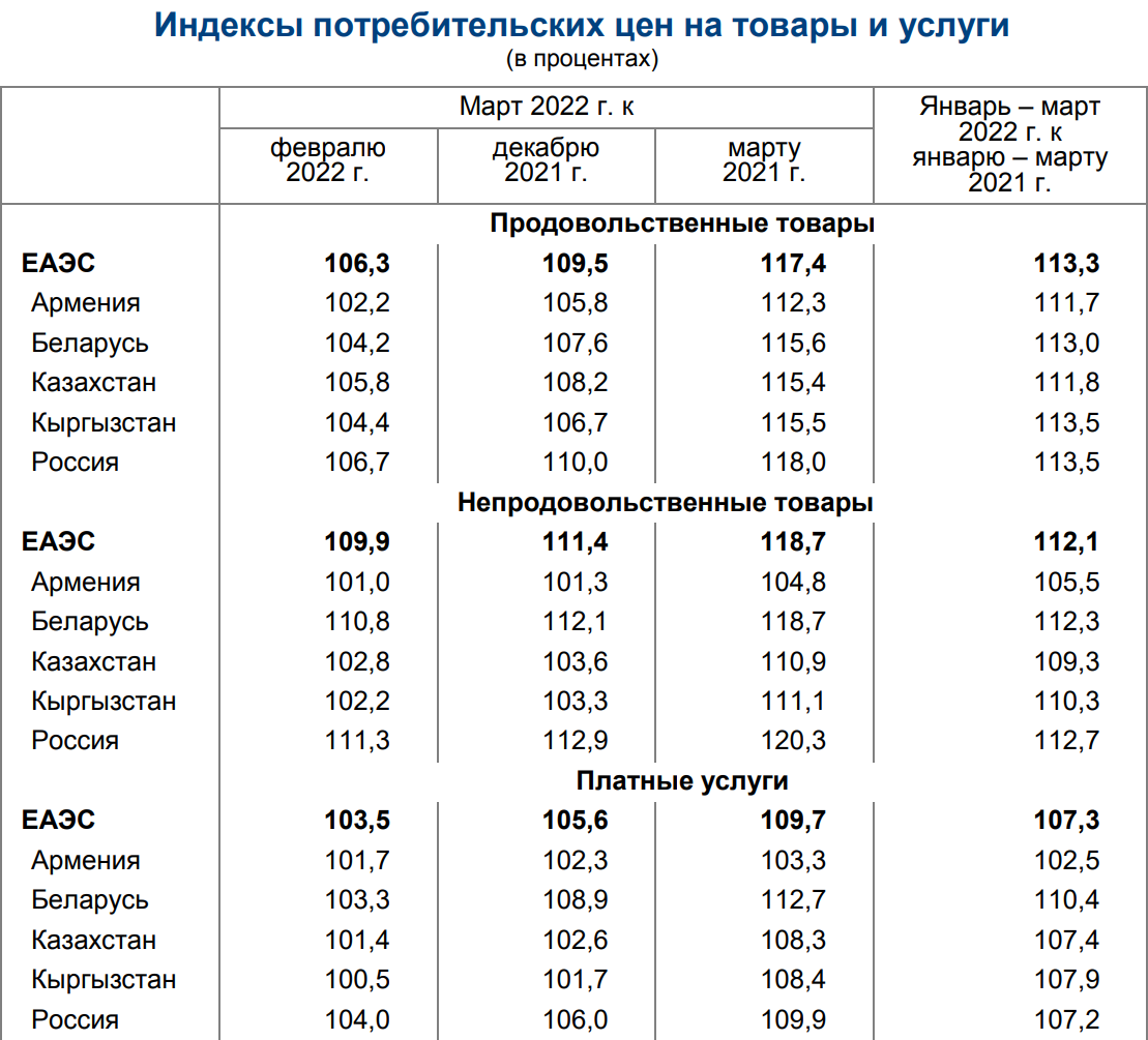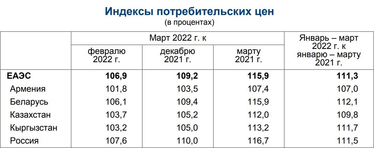В марте индекс потребительских цен на товары и услуги в среднем по ЕАЭС в сравнении с предыдущим месяцем увеличился на 6,9%. В сравнении с февральскими показателями в странах ЕАЭС индекс потребительских цен существеннее всего вырос в России (на 7,6%) и Беларуси (6,1%), а меньше всего – в Армении (на 1,8%).