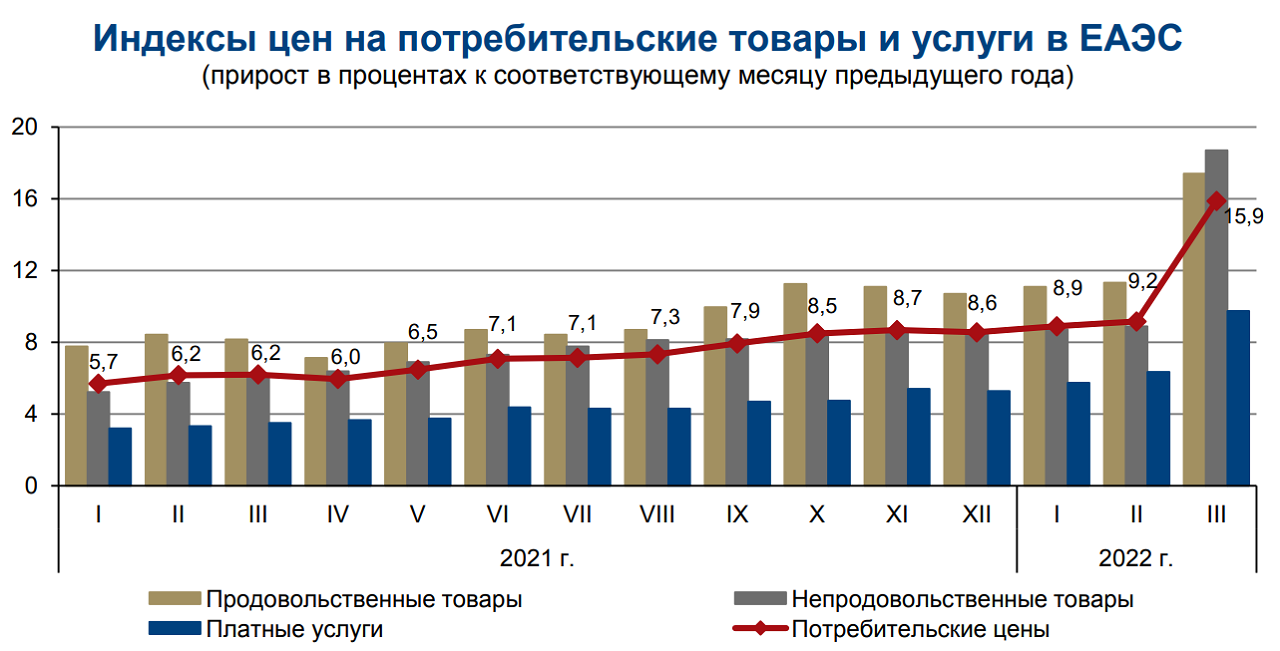 Если сопоставлять показатели с декабрем прошлого года, то рост индекса потребительских цен в ЕАЭС составил 9,2%. Непродовольственные товары подорожали за этот период на 11,4%, продукты питания – на 9,5%, а услуги – на 5,6%.