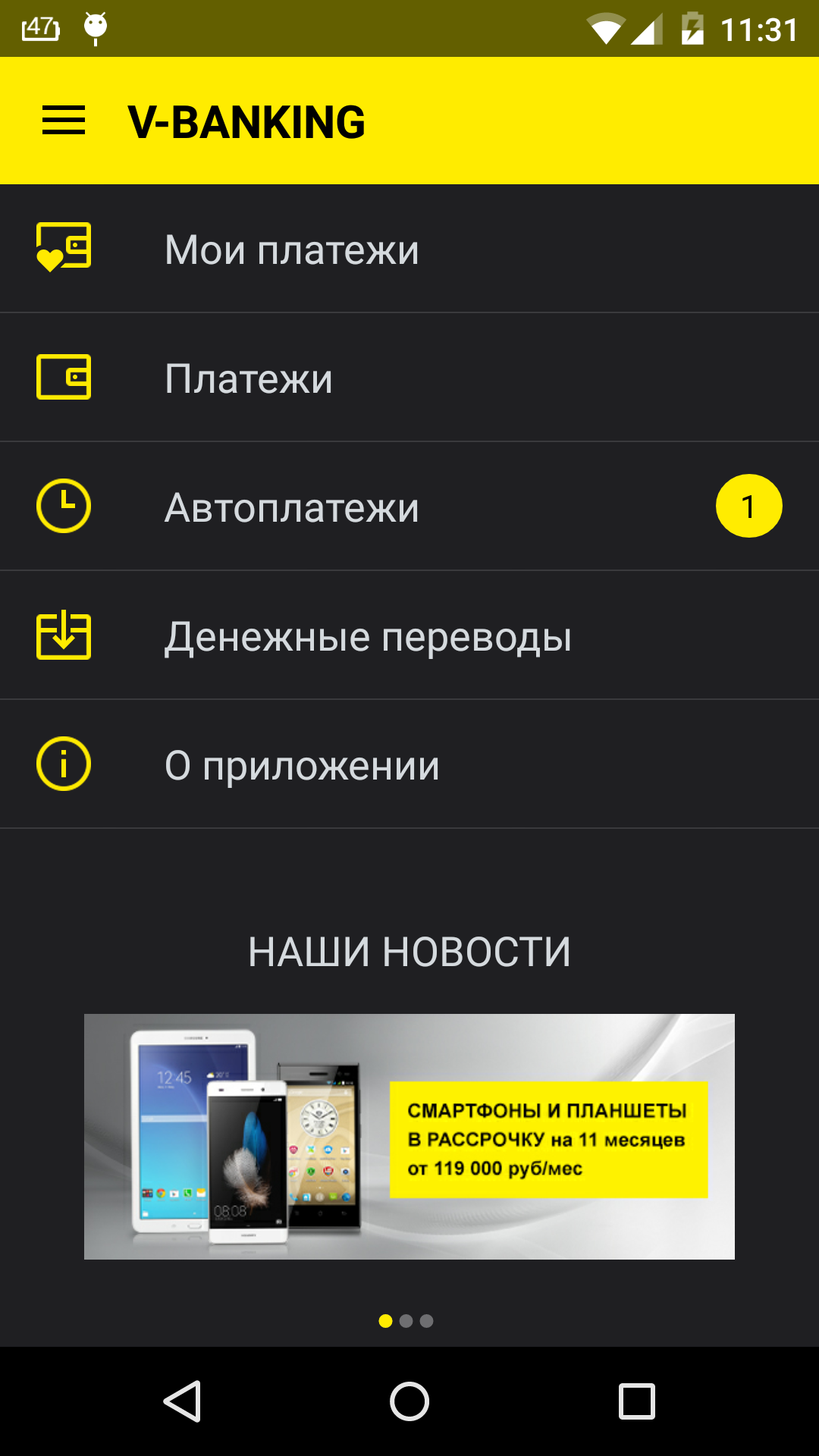 Кроме переводов можно настроить и автоматические платежи. Функция предусматривает календарь напоминаний, который в определенное время уведомит своего хозяина о необходимости совершения платежа, например, квартплаты или абонплаты, а также позволит в несколько кликов оплатить данные услуги. Дополнительно в приложении v-bankingпредусмотрена возможность «подтянуть» все свои ранее совершенные платежи в раздел «Мои платежи», указав в настройках аккаунта свой номер плательщика в Системе «Расчет» (ЕРИП).