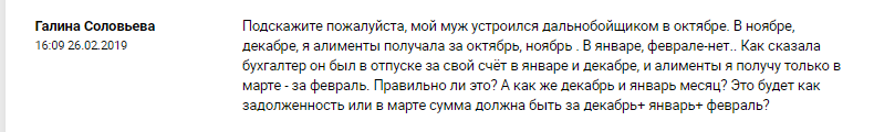 В вопросе не дается указание на причину, по которой был предоставлен отпуск за свой счет. Если такая причина не была уважительной, то наниматель должен учитывать имеющиеся у работника обязанности по уплате алиментов. В таком случае алименты за декабрь и январь Галина должна получить в марте. Если же наниматель счел причину отпуска за свой счет уважительной, то в марте будет перечислена сумма алиментов за февраль, т.е. за период, когда супруг уже работал.