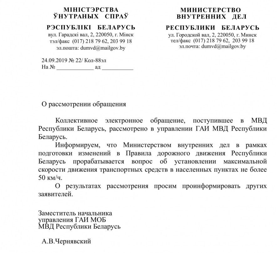 МВД Беларуси прорабатывает вопрос о том, чтобы снизить скорость в населенных пунктах до 50 км/ч. Об этом сообщил заместитель начальника УГАИ МВД Андрей Чернявский в письменном ответе на обращение, опубликованное на сайте «Удобный город». Под обращением подписалось 759 человек, в МВД документ направили 9 сентября.