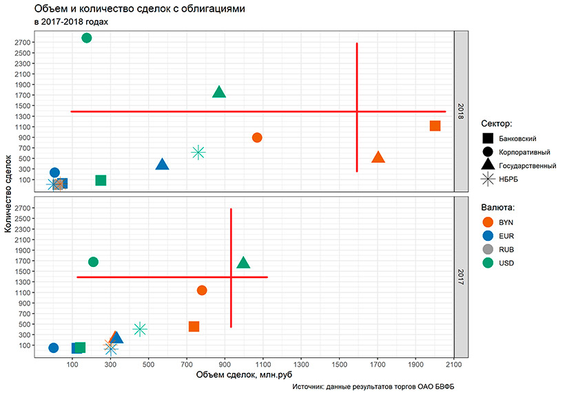 Корпоративный сегмент также, как и банковский, поддержал тенденцию увеличения числа крупных сделок с облигациями, номинированными в белорусских рублях. Ввиду низкой базы сравнения в 2017 мы наблюдаем высокий процентный прирост показателей по сделкам с бумагами в евро в 2018 году. При этом в корпоративном секторе, как и в государственном, произошло снижение на 13% в объемах по сделкам с долларовыми бумагами.