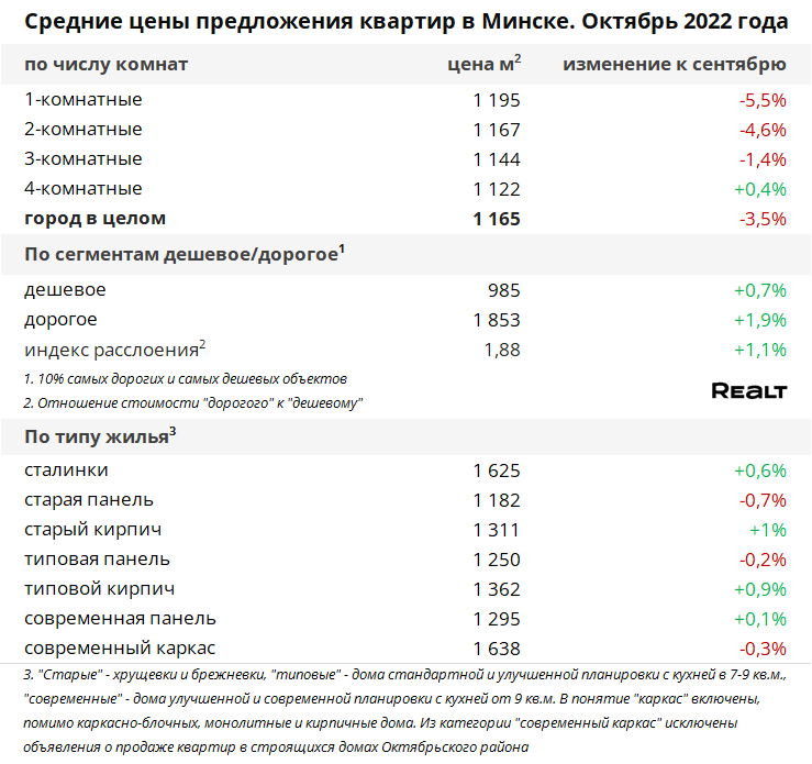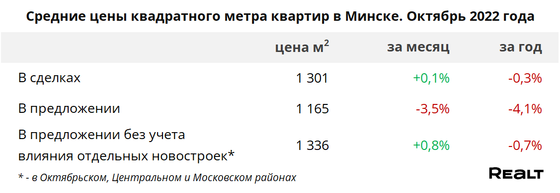 Средняя цена проданных в Минске квартир за октябрь 2022 года составила 1301 $/м2, что практически столько же, сколько в сентябре.