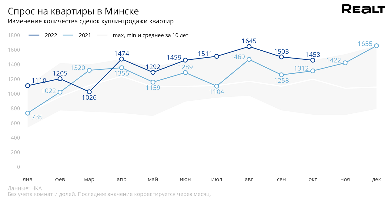 Площадка недвижимости Realt.by в своем материале сообщает о том, что в октябре 2022 года в Минске совершено 1458 сделок купли-продажи квартир – рекорд для этого месяца как минимум за последние десять лет. Портал также проанализировал основные тенденции на рынке недвижимости столицы в середине осени.