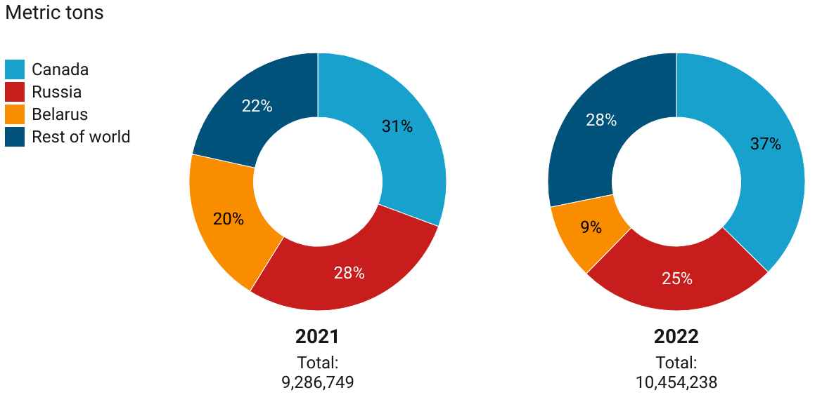 Введение санкций и усложнение логистики привели к падению экспорта в Бразилию, которая на протяжении ряда лет была ключевым покупателем белорусских калийных удобрений. За первые девять месяцев 2021 года на долю Беларуси приходилось около 20 % от всего импорта калия в южноамериканское государство. За тот же период 2022 года этот показатель заметно снизился, составив менее 10 % от общего объема ввоза. При этом значительная часть снижения была компенсирована за счет поставок из Канады.