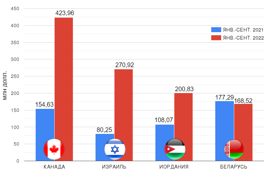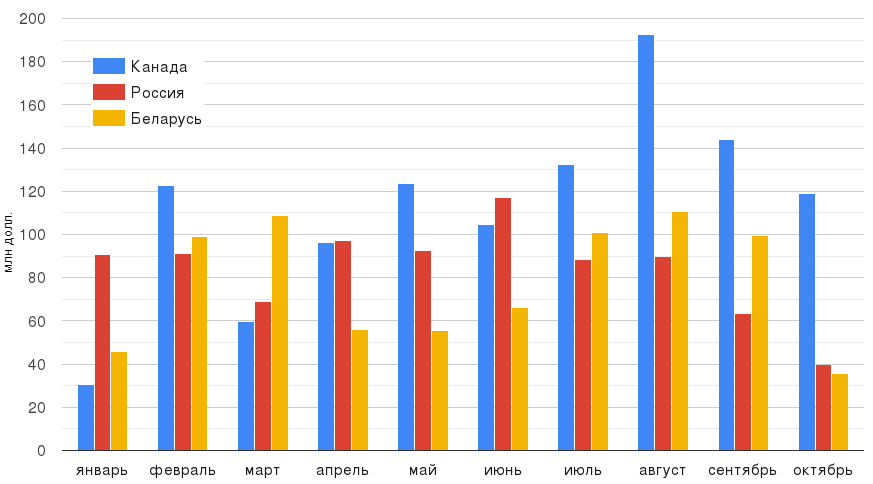 Максимальные значения импорта из Беларуси за первые 10 месяцев 2022 года наблюдались в марте ($108,8 млн) и августе ($110,6 млн), минимальные — в январе ($45,9 млн) и октябре ($35,6 млн). Наибольший объем импорта (в стоимостном выражении) из Канады был в августе ($192,8 млн), из Российской Федерации — в июне ($117,1 млн).