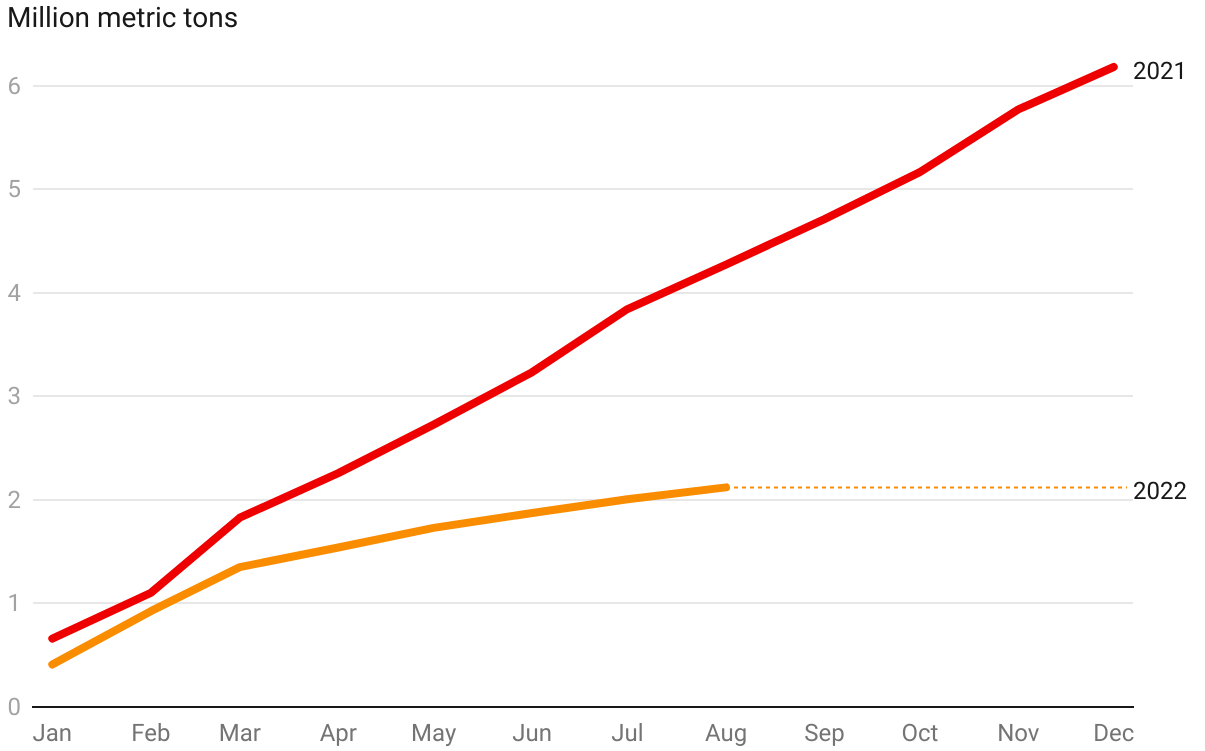 Согласно данным Международного исследовательского института продовольственной политики (IFPRI), в период с января по август 2022 года экспорт калия из Беларуси в количественном выражении сократился на 50 % к аналогичному периоду прошлого года. При этом следует учитывать, что расчеты производились на основании сообщений торговых партнеров (53 государства) и не претендуют на стопроцентную точность.