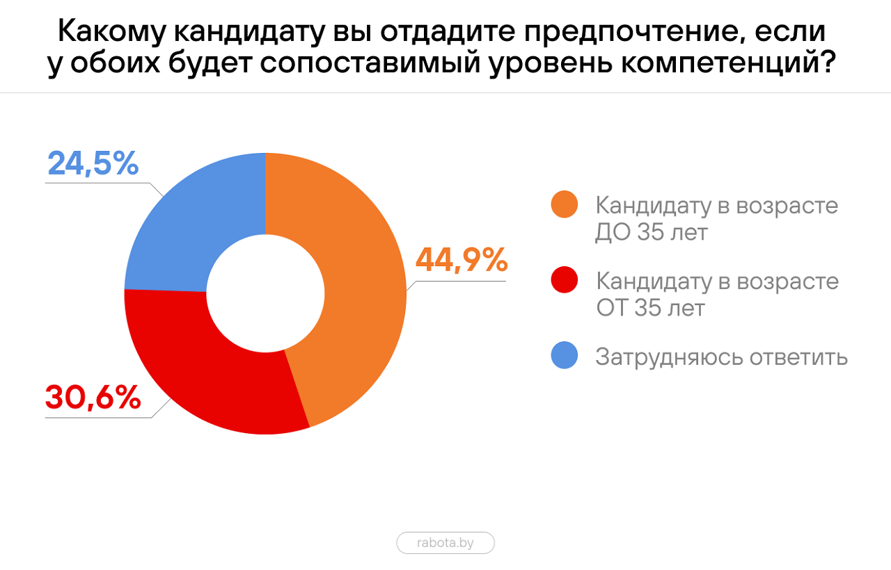 В то же время если опрошенных нанимателей поставить перед выбором между двумя кандидатами с сопоставимым уровнем компетенций, то около 45% выберут кандидата в возрасте до 35 лет.