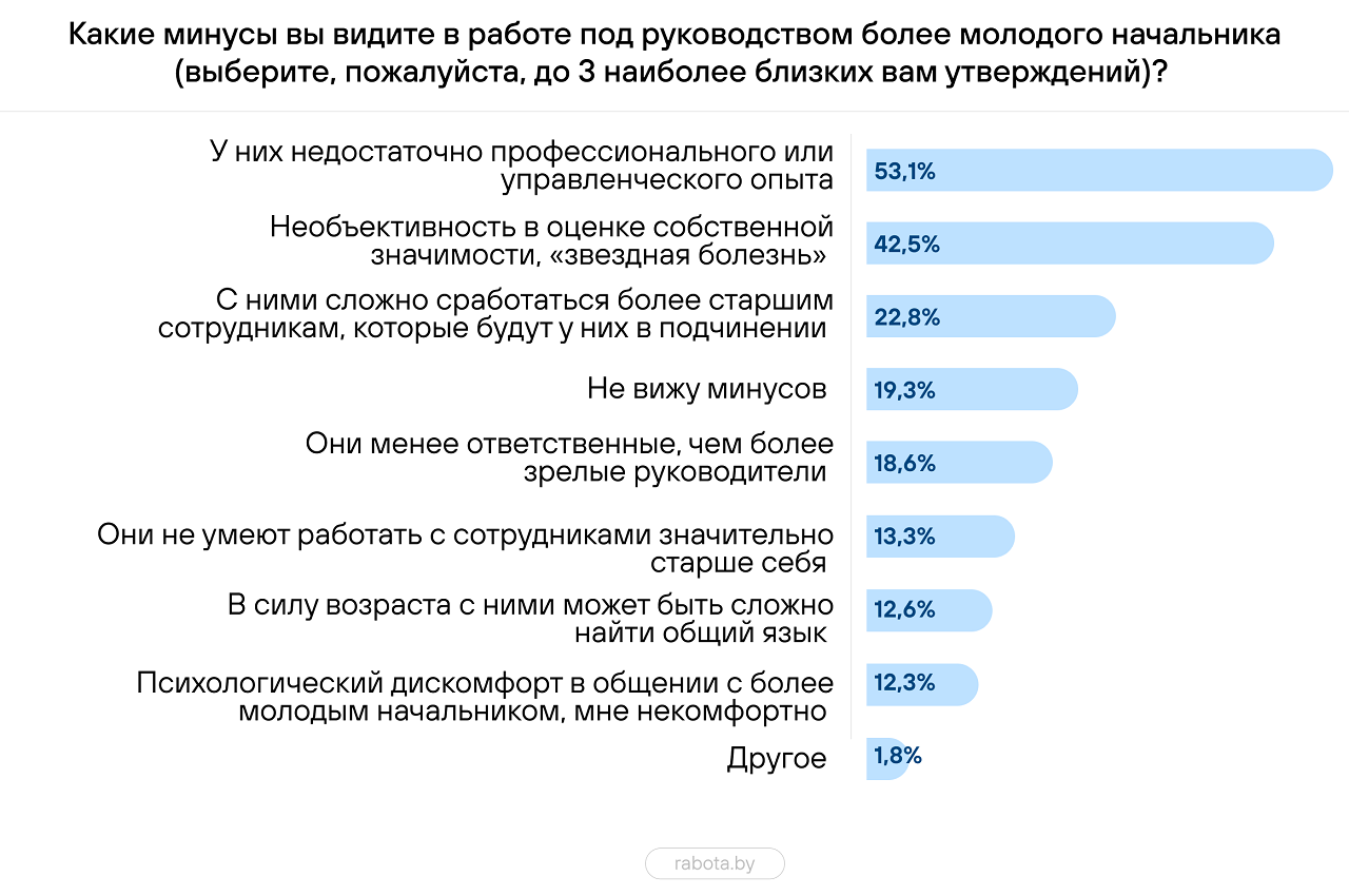 В то же время практически каждый второй специалист (52,3%) нейтрально относится к работе под руководством начальника, который будет моложе его более чем на 10 лет.