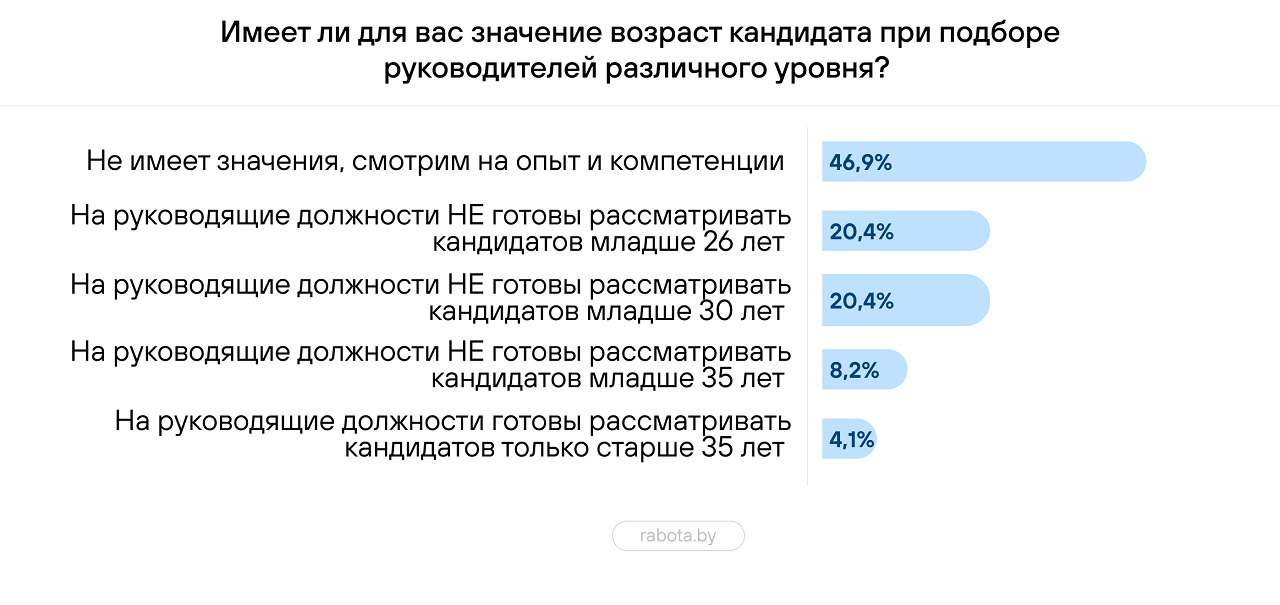 Дополнительно около 47% опрошенных нанимателей сообщили, что при подборе руководителей различного уровня возраст для них не имеет значения и в первую очередь они оценивают опыт и компетенции.