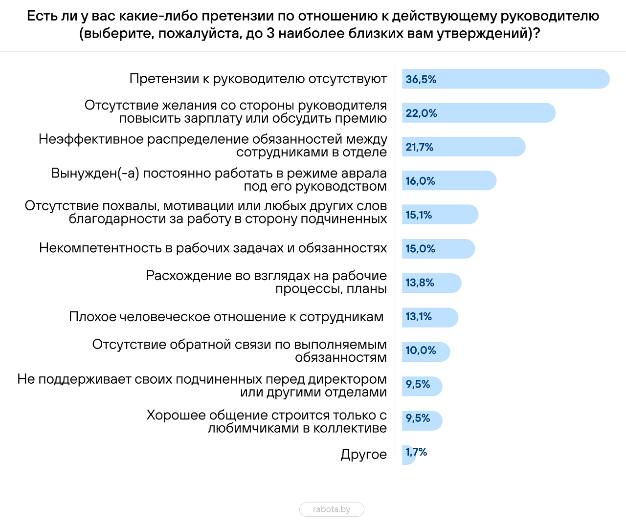 Вне зависимости от возраста текущего руководителя у многих специалистов назрели претензии к действующему начальству, только чуть более трети отметили их отсутствие (36,5%). Чаще всего жаловались на: