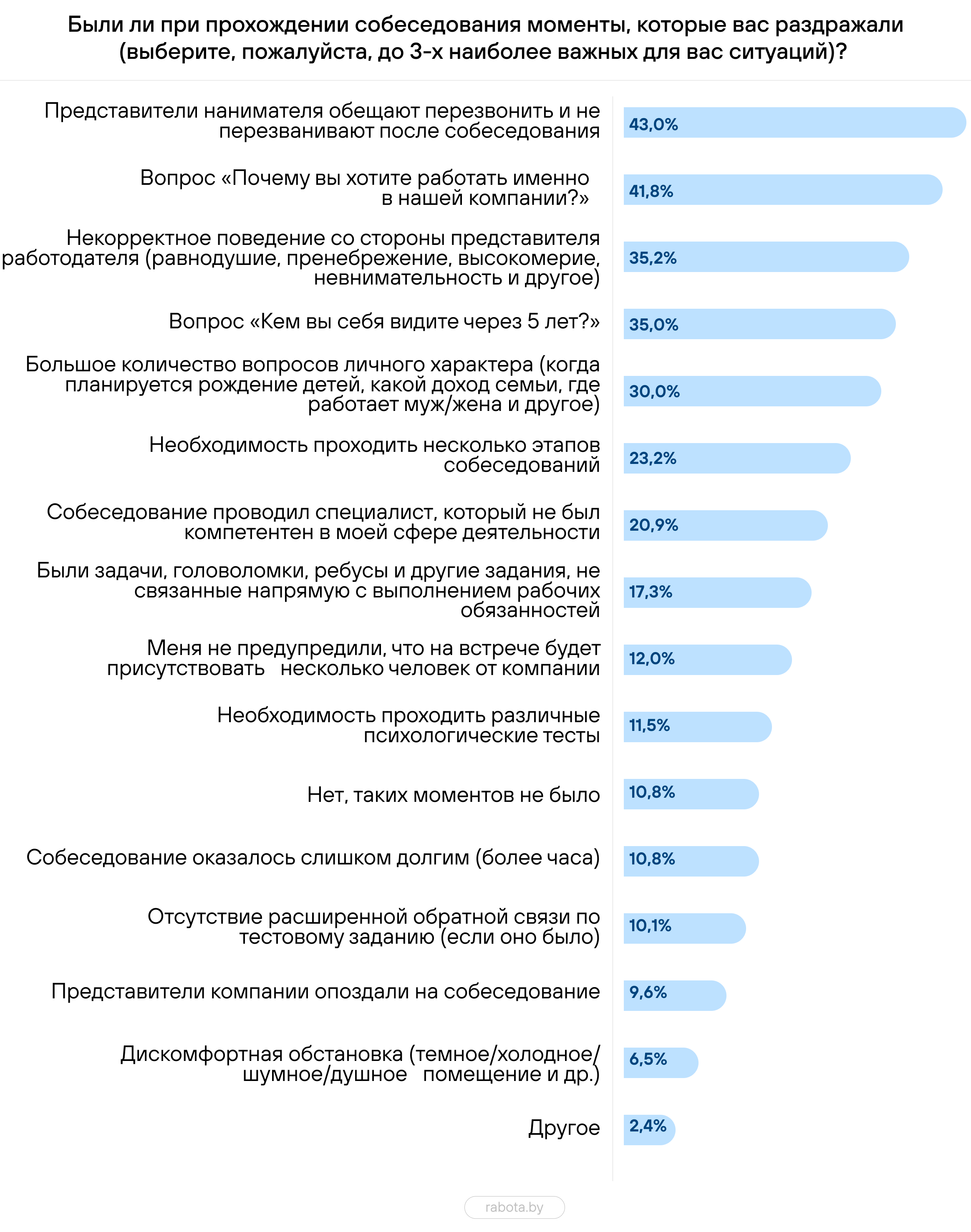 Выделили соискатели и наиболее раздражающие моменты собеседований любого формата.