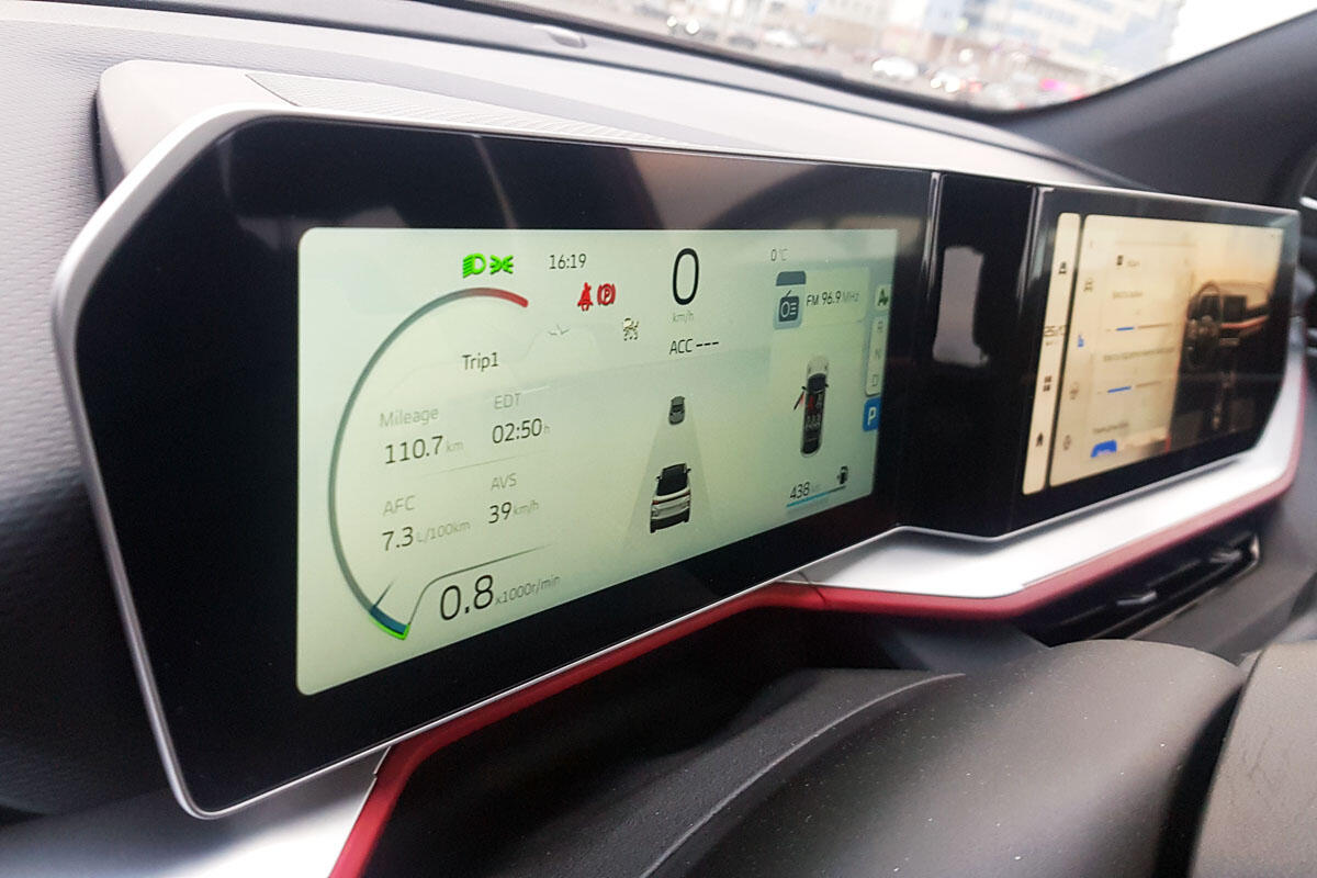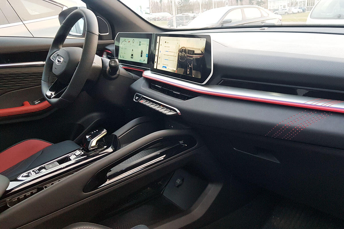 Именно так воспринимается салон нового Coolray, едва распахиваешь любую из дверей автомобиля. Бесключевой доступ в кроссовере комплектации Flagship Plus, равно как и дистанционный запуск двигателя, – опции, вне всяких сомнений, полезные, но они были и в прежней машине. А вот подросшие и объединенные в единый блок дисплеи приборного щитка и мультимедийной системы – своего рода изюминка новинки. И читаются, и смотрятся они великолепно.