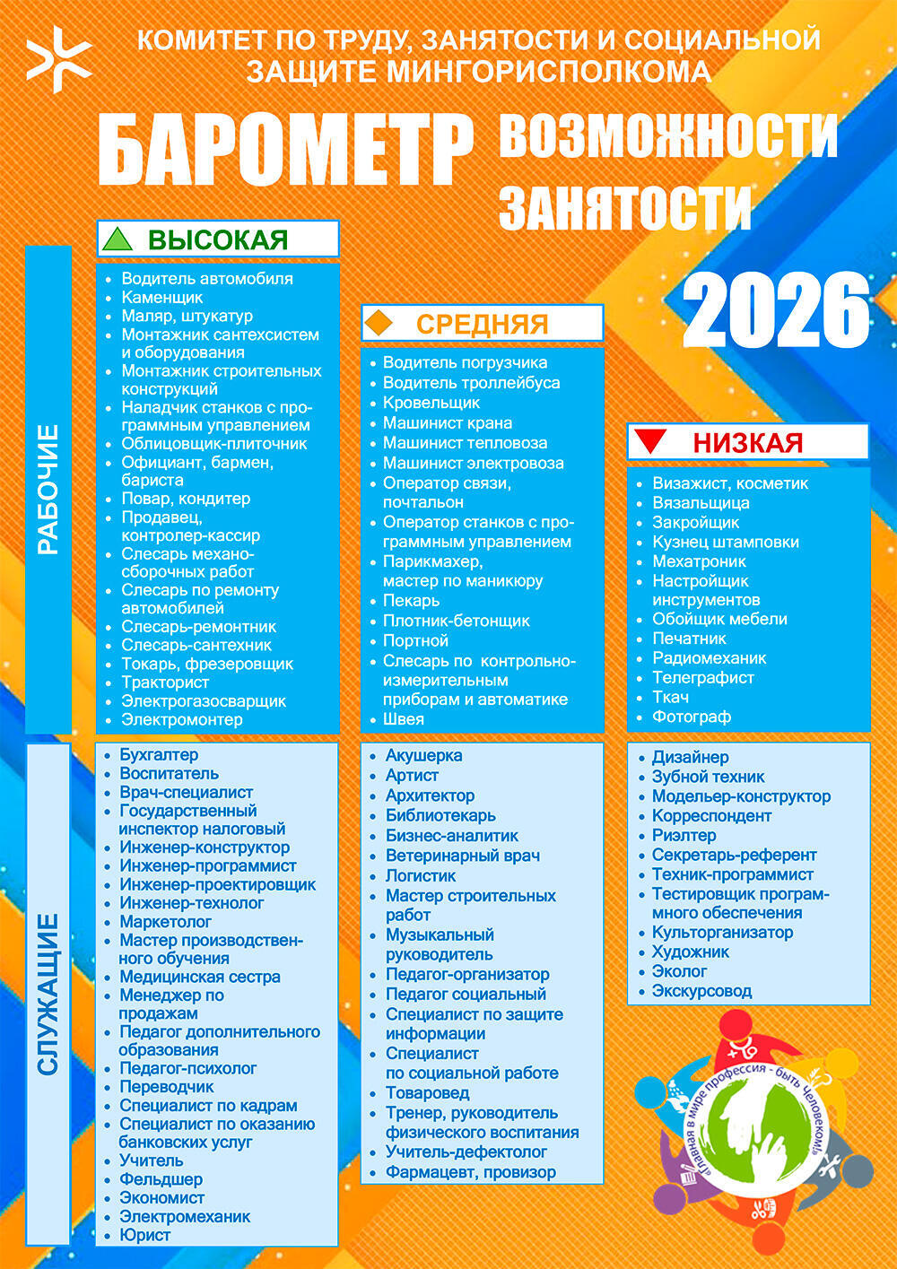Есть и прогноз на 2026 год — «Барометр возможности занятости в Минске в 2026 году». Согласно исследованию, среди рабочих самыми востребованными в этом году будут водители автомобиля, каменщики, маляры, штукатуры, монтажники строительных конструкций, официанты, повара, продавцы, электромонтеры и др.