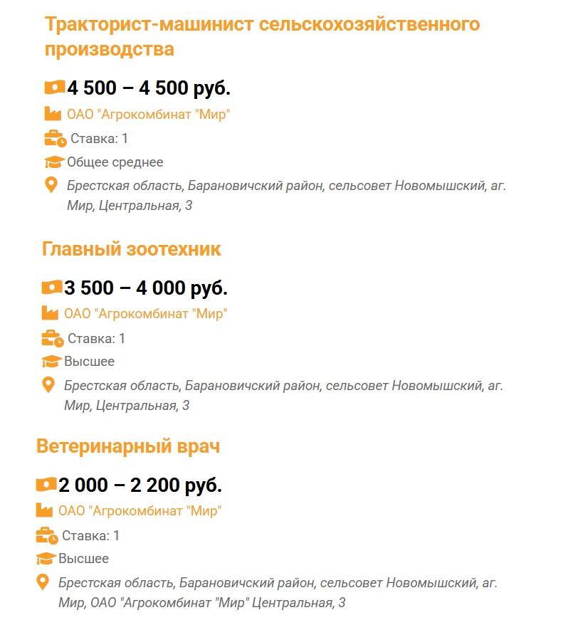 - ОАО «Агрокомбинат «Юбилейный»: обвальщик мяса (4000–4050 руб.), мастер цеха мясопереработки (2900–3000 руб.), оператор машинного доения (2700–2750 руб.);