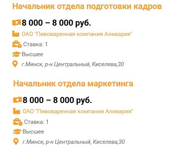 На сайте службы занятости опубликовано несколько вакансий, нанимателем по которым выступает ОАО «Пивоваренная компания Аливария».