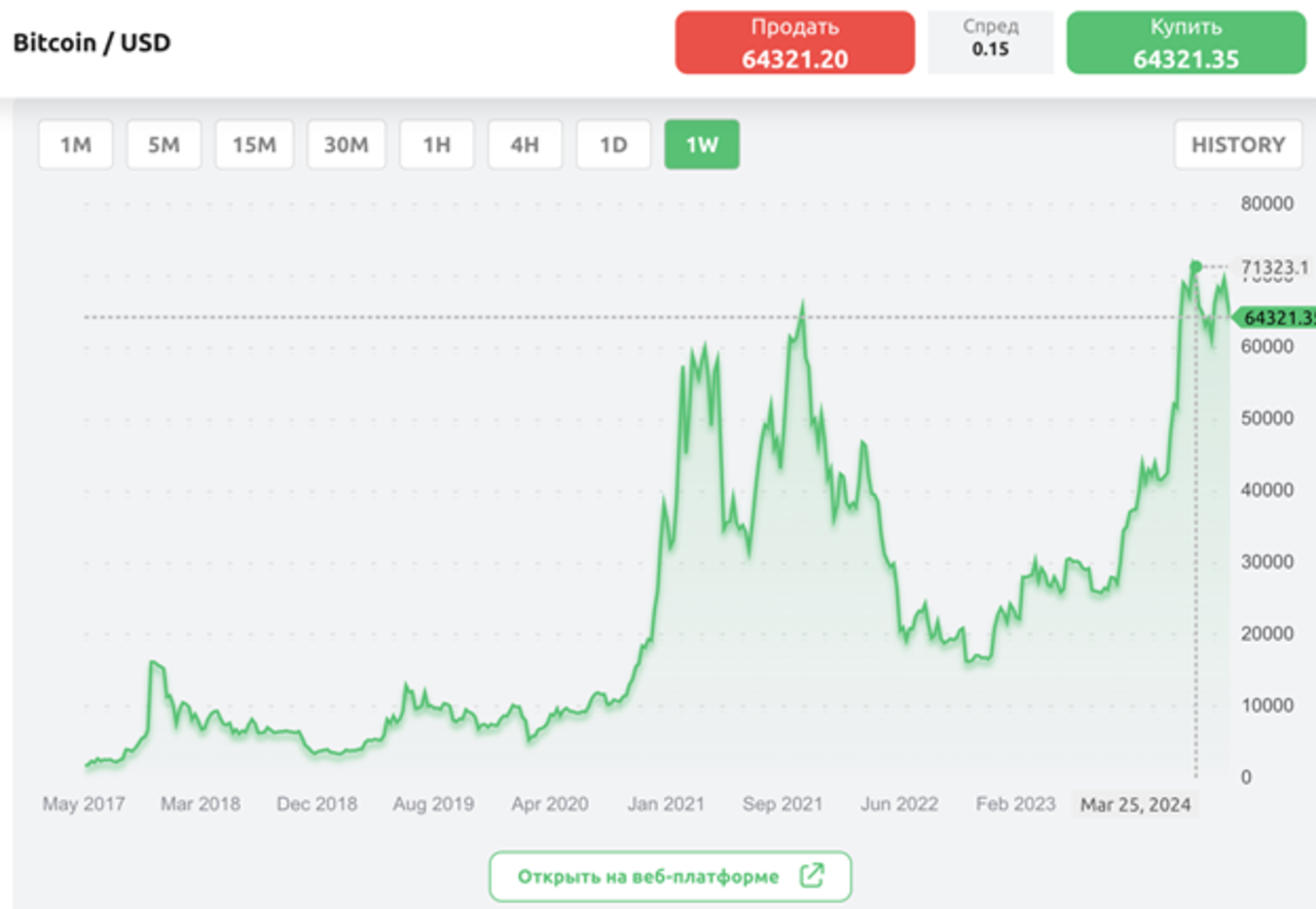 Если посмотреть на график биткоина, то можно обнаружить, что в текущем году пик его цены уже произошел - более 71 тыс. долларов, однако альтсезон еще не наступил. Сложно сказать, достигнет ли биткоин отметки 100 тыс. долларов в этом году, но однозначно потенциал для роста еще значителен.
