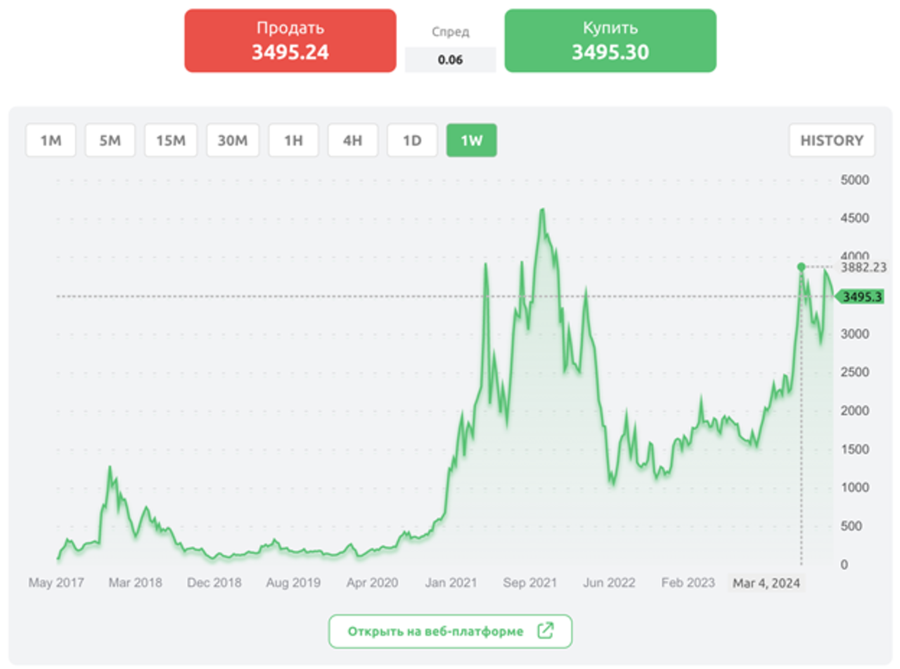 Если посмотреть на некоторые другие крупные криптовалюты, то они пока далеки от своих исторических пиков. Например, курс крупнейшего альткоина Ethereum в текущем году достиг локального пика (3882 доллара за монету), но пока далек от исторического максимума, зафиксированного в 2021, когда он стоил более 4600 долларов.