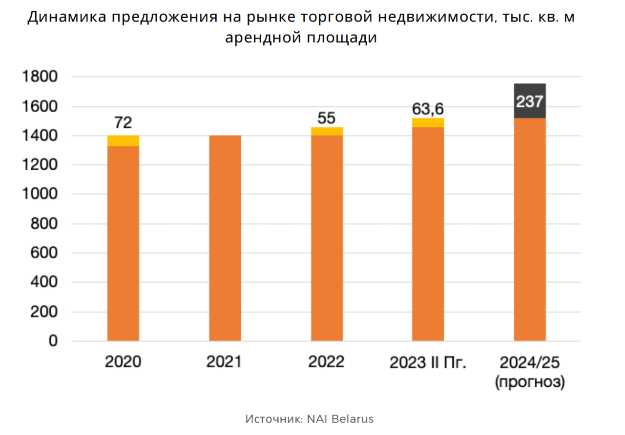 В период 2024 — начала 2025 годов ожидается еще более масштабное предложение площадей на рынке. Так, на данный период запланированы такие торговые объекты, как ТРЦ «Авиа Молл», «Червенский», «Призма», «Мега Парк»… С менее масштабными проектами в сегменте торговой недвижимости на подходе свыше 250 тыс. кв. м валовой арендной площади.