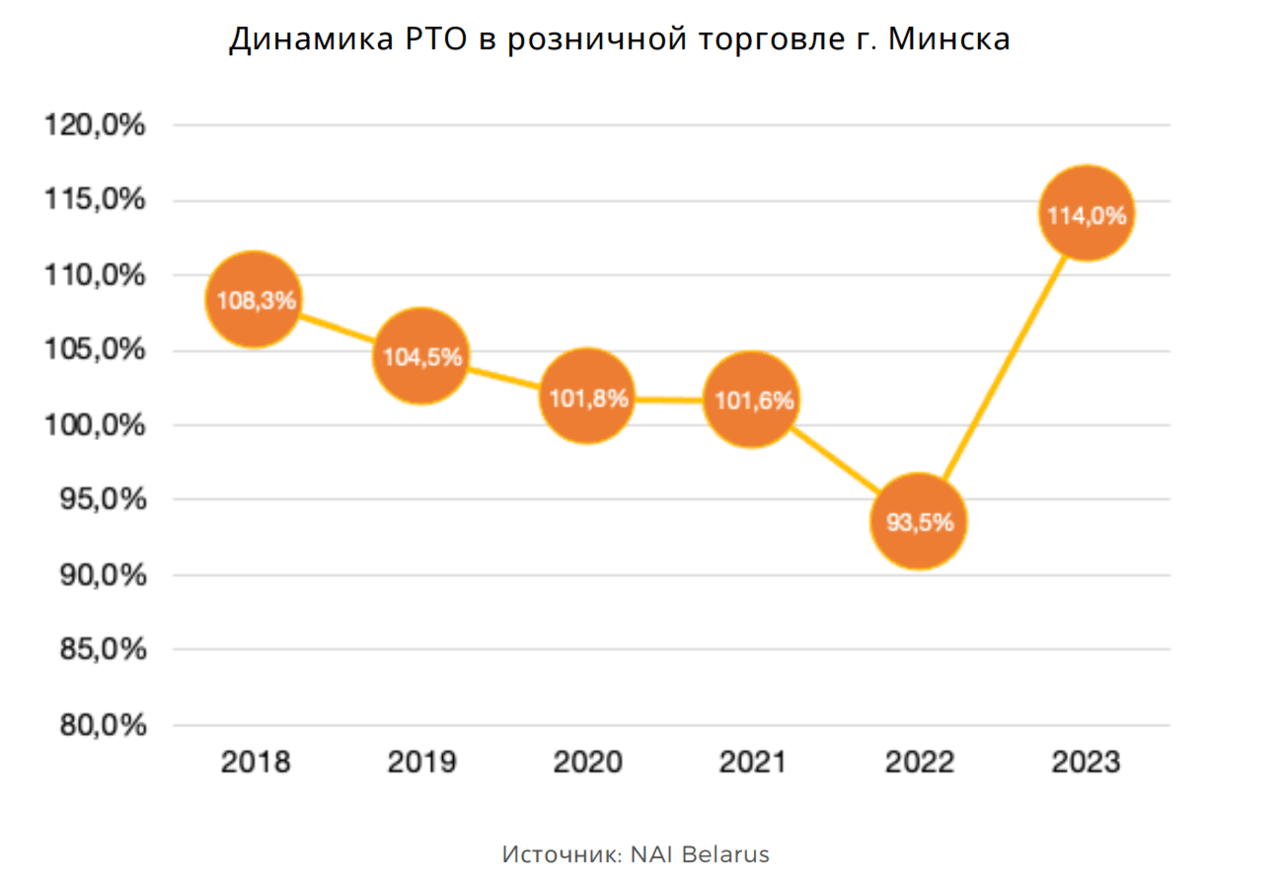Когда в прошлом году кратко характеризовал итоги на рынке ритейла и торговой недвижимости за 2022 год, сразу возникала фраза: «Могло быть и хуже!». Если также емко охарактеризовать итоги ушедшего 2023 года, лучшим выражением будет: «Чтобы и дальше так было!», — констатирует партнер, исполнительный директор NAI Belarus Андрей Алешкин. А почему бы и нет? Основной показатель «здоровья» отрасли, динамика рынка торговых объектов (РТО) минской торговли, по итогам года составила +15,1%, вакантность в действующих ТЦ/ТРЦ сокращалась.