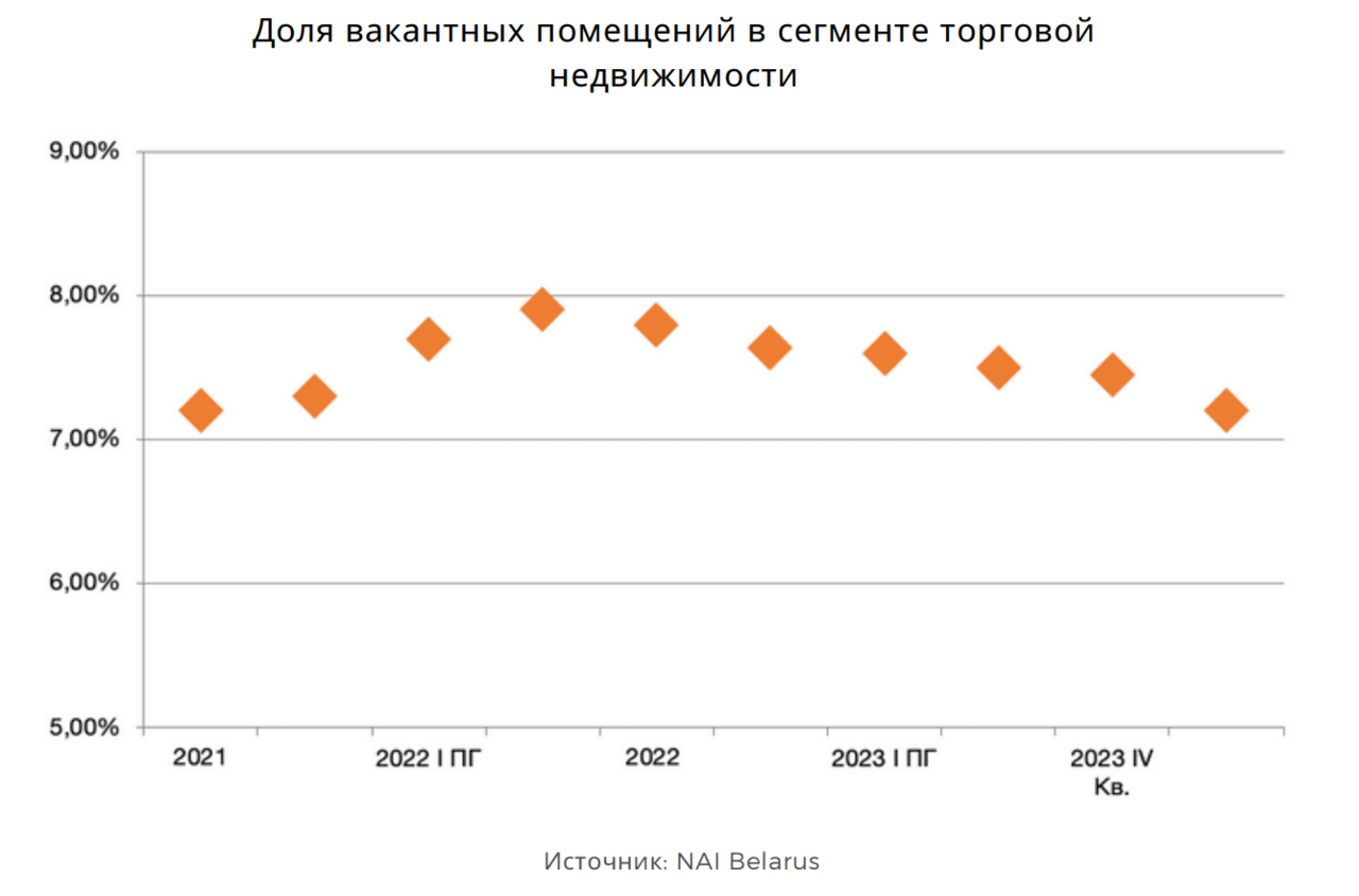 В IV-ом квартале отмечено сокращение числа торговых объектов сети «Буслiк», что грозило ростом вакантности тем объектам, где данная сеть выступала в качестве арендатора. Однако закрытия пока коснулись объектов в регионах. В минских ТЦ/ТРЦ до конца 2023 года освобождения арендованных сетью помещений не произошло.