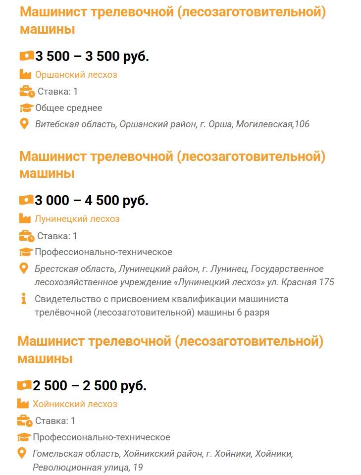 Ряду учреждений нужен машинист трелевочной (лесозаготовительной) машины. Так, работу предлагают Оршанский, Лунинецкий, Хойникский и другие лесхозы.