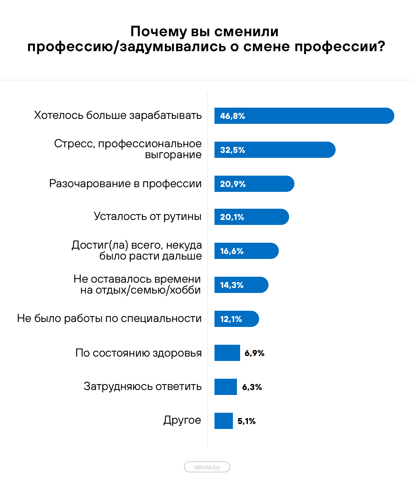 Чаще всего люди объясняли стремление сменить профессию желанием заработать больше, высоким уровнем стресса и выгоранием, а также разочарованием в профессии и усталостью от рутины.