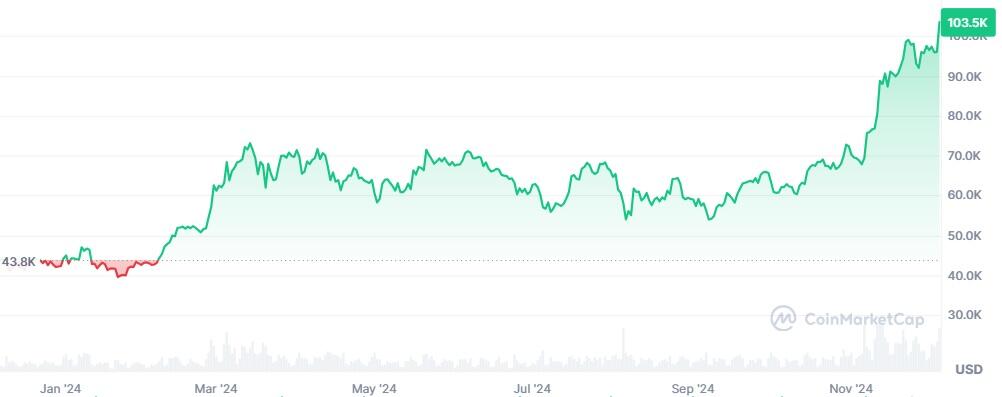 Как сообщается, стоимость биткоина увеличилась более чем на 4% до $103,54 тыс., на пике поднявшись до $103,84 тыс. С начала года биткоин вырос почти на 140% и на 48% после президентских выборов в США.