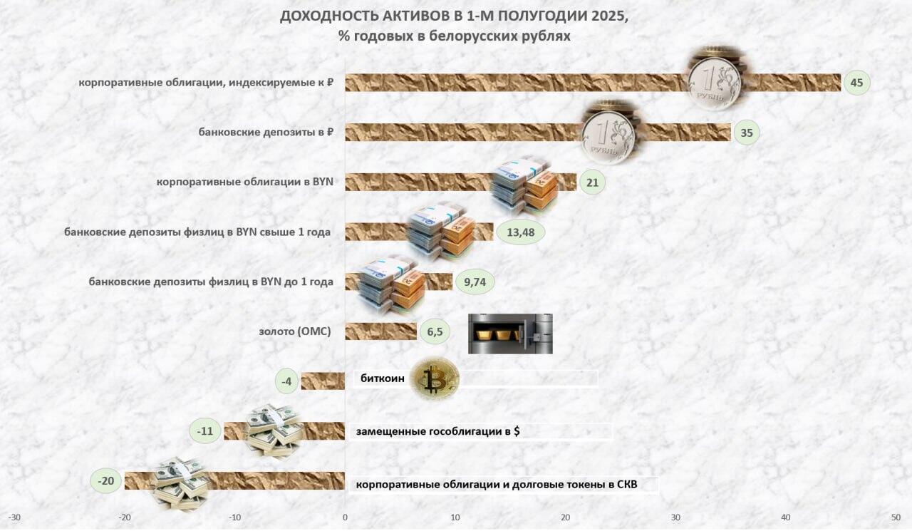 Инвестиционная компания «Айгенис» проанализировала, как в первой половине 2025 года менялась стоимость различных активов, доступных белорусским инвесторам. Брокер уточняет, что значительное влияние на финансовый результат оказала валютная переоценка.