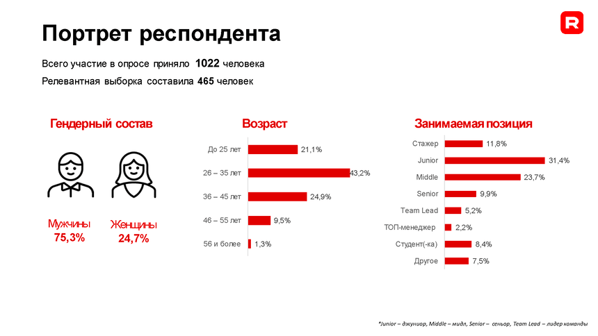 В текущем году в опросе приняли участие 1022 человека, из которых 465 респондентов учатся или работают в ИТ. В опросе поучаствовало больше специалистов уровня middle (23,7% в 2022 против 20,7% в 2021), и увеличился средний возраст респондентов. В 2021 году более 45% опрошенных были моложе 30 лет.