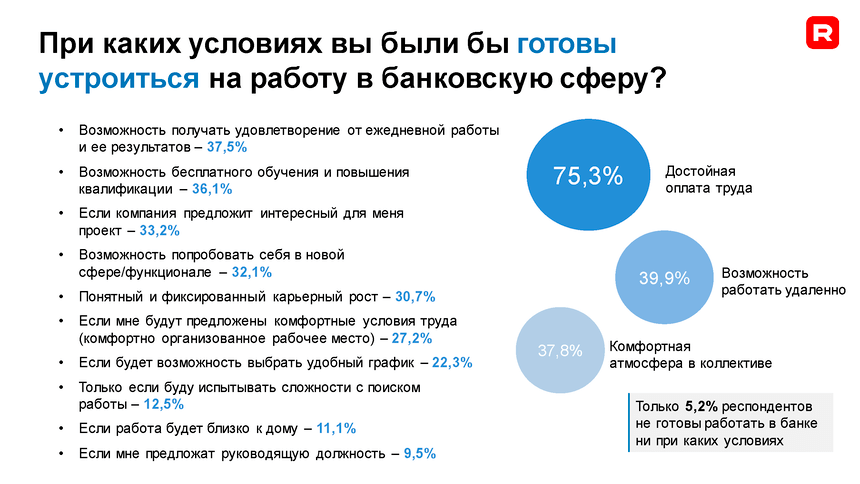 В прошлом году респонденты выносили в ТОП-3 также возможность работать на интересном проекте – в этом году этот вариант только на 6-м месте по популярности. Только 5,2% опрошенных не готовы работать в банке ни при каких условиях. В прошлом году это было 12,8%. Таким образом, можно сделать вывод, что ИТ-соискатели становятся более лояльны к банковской сфере.