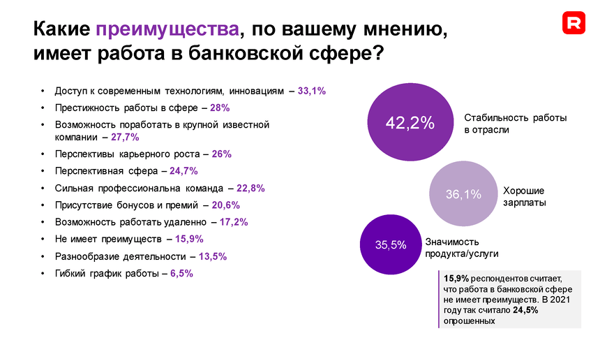 - Порядка 15,9% респондентов придерживаются мнения, что работа в банковской сфере не имеет преимуществ. В 2021 году так считало 24,5% опрошенных.
