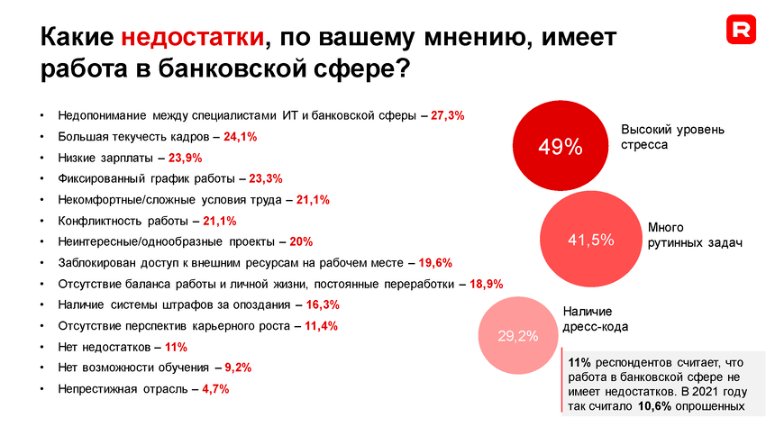 Если рассматривать недостатки работы в банковской сфере, то, по мнению соискателей, как и в прошлом году, наиболее распространенным ответом стал «Высокий уровень стресса».